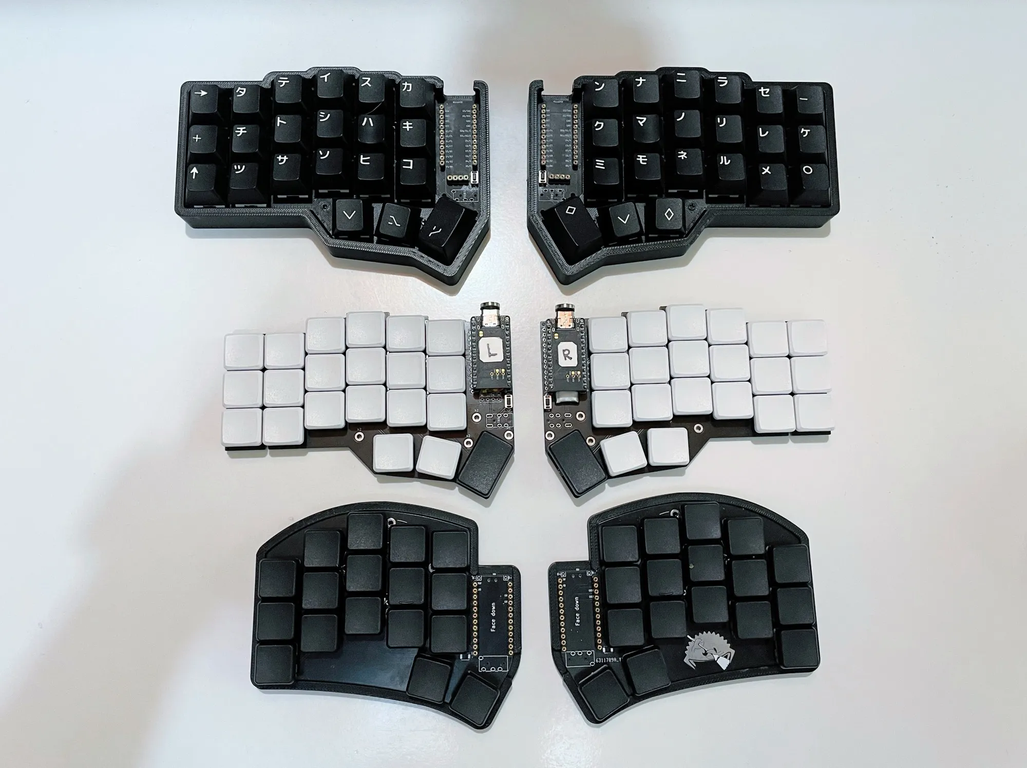 Here is the size comparison of other split keyboards I have: a Corne MX, a Corne Low Profile, and a Sweep which I built shortly after finishing the Corne. (Spoiler alert: I ended up not using the Sweep).