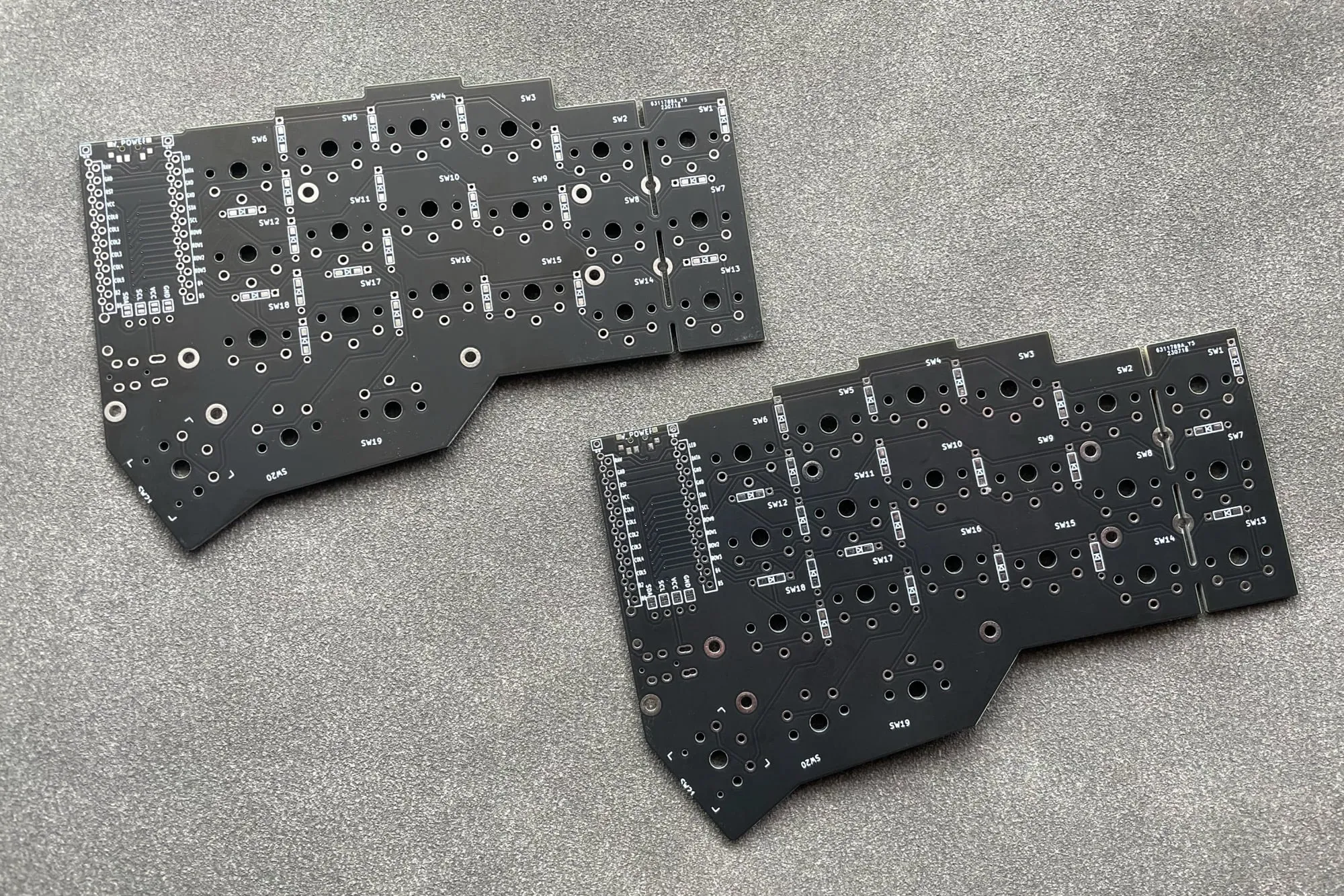 One difference though is this board has power switches. I put them on and found out later that they don't work because I'm putting the batteries directly to the Nice!nano controllers, not to the PCB. So the switches are not able to cut the power from the batteries to the controllers.