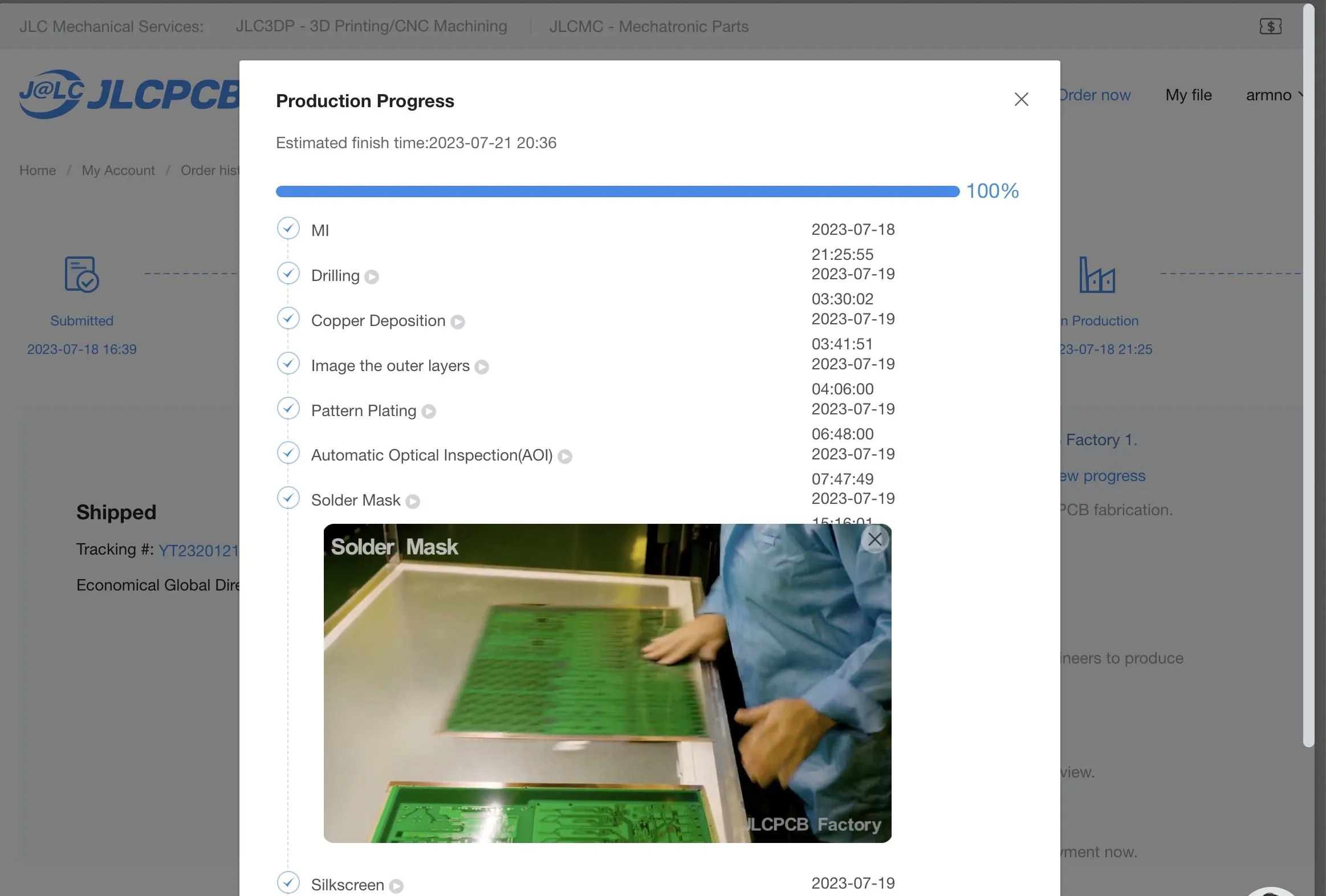 The production takes about 2 days from start to finish. I like that they have timestamps for every step my PCB goes through, with the video of what's happening in that step.